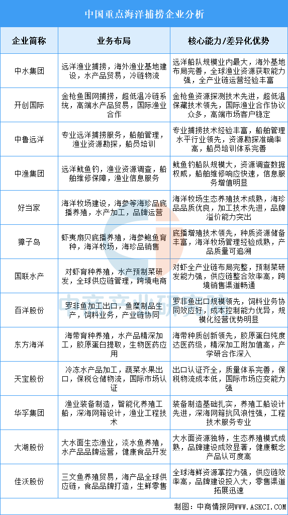 中商情報網訊:行業正經歷從近海捕撈向遠洋漁業轉型升級的關鍵階段,技術競爭聚焦遠洋船隊現代化、資源探測能力和可持續捕撈技術,產業鏈從捕撈向加工、貿易一體化延伸。中水集團以遠洋漁業資源和船隊規模主導市場;開創國際借金槍魚圍網技術鞏固高端魚類市場;中魯遠洋依托專業捕撈服務實現差異化發展。
