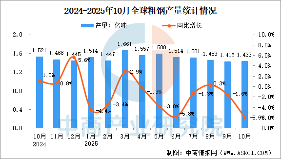 2025年10月全球粗鋼產(chǎn)量分析:同比下降5.9%(圖)