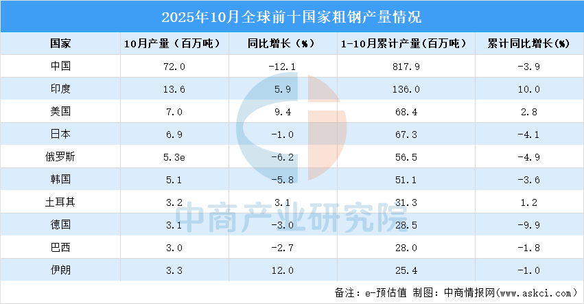 2025年10月,中國(guó)粗鋼產(chǎn)量為7200萬(wàn)噸,同比下降12.1%;印度粗鋼產(chǎn)量為1360萬(wàn)噸,同比提高5.9%;美國(guó)粗鋼產(chǎn)量為700萬(wàn)噸,同比提高9.4%;日本粗鋼產(chǎn)量為690萬(wàn)噸,同比下降1.0%;俄羅斯粗鋼預(yù)估產(chǎn)量為530萬(wàn)噸,同比下降6.2%;韓國(guó)粗鋼產(chǎn)量為510萬(wàn)噸,同比下降5.8%;土耳其粗鋼產(chǎn)量為320萬(wàn)噸,同比提高3.1%;德國(guó)粗鋼產(chǎn)量為310萬(wàn)噸,同比下降3.0%;巴西粗鋼產(chǎn)量為300萬(wàn)噸,同比下降2.7%;伊朗粗鋼產(chǎn)量為330萬(wàn)噸,同比提高12.0%。