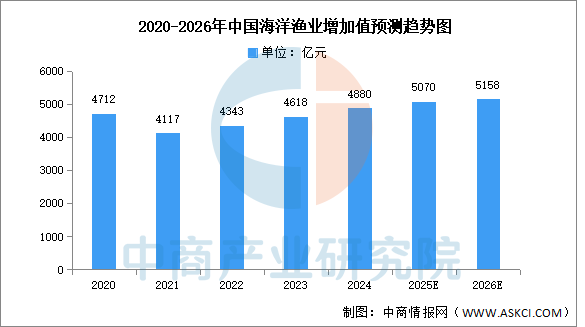2024年實(shí)現(xiàn)增加值4880億元,比上年增長(zhǎng)4.0%。海洋漁業(yè)現(xiàn)代化建設(shè)加快推進(jìn),養(yǎng)捕結(jié)構(gòu)進(jìn)一步優(yōu)化,水產(chǎn)種業(yè)振興和深遠(yuǎn)海養(yǎng)殖促進(jìn)水產(chǎn)品消費(fèi)升級(jí),“互聯(lián)網(wǎng)+設(shè)施漁業(yè)”助力海水養(yǎng)殖不斷向綠色化、智能化轉(zhuǎn)型,海洋水產(chǎn)品穩(wěn)產(chǎn)保供能力持續(xù)提高。中商產(chǎn)業(yè)研究院分析師預(yù)測(cè),2025年我國(guó)海洋漁業(yè)將達(dá)5070億元,2026年將達(dá)5158億元。