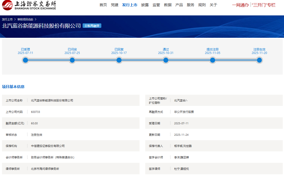 11月26日,北汽藍(lán)谷發(fā)布公告稱,公司于2025年11月24日收到中國證券監(jiān)督管理委員會出具的《關(guān)于同意北汽藍(lán)谷新能源科技股份有限公司向特定對象發(fā)行股票注冊的批復(fù)》,同意公司向特定對象發(fā)行股票的注冊申請。根據(jù)上交所披露信息,該筆申請已于11月20日注冊生效。